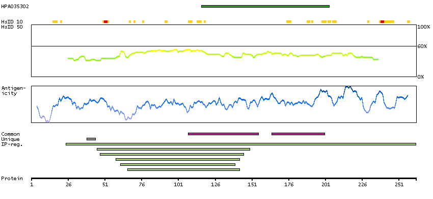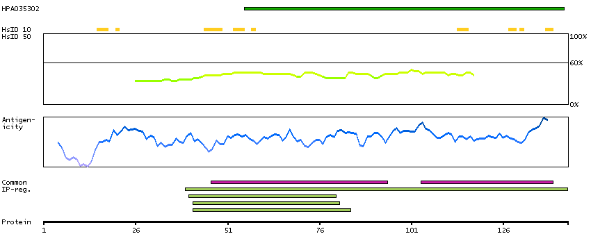 Under the antigens, the maximum percent sequence identity of the protein to all other proteins from other human genes is displayed, using a sliding window of 10 aa residues (HsID 10) or 50 aa residues (HsID 50). The region with the lowest possible identity is always selected for antigen design, with a maximum identity of 60% allowed for designing a single-target antigen (read more).