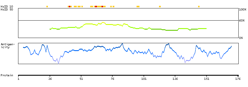 Under the antigens, the maximum percent sequence identity of the protein to all other proteins from other human genes is displayed, using a sliding window of 10 aa residues (HsID 10) or 50 aa residues (HsID 50). The region with the lowest possible identity is always selected for antigen design, with a maximum identity of 60% allowed for designing a single-target antigen (read more).