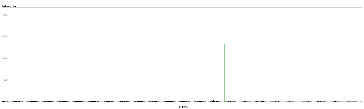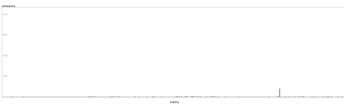 At the top of the view, the position of the antigen (identified by the corresponding HPA identifier) is shown as a green bar. A yellow triangle on the bar indicates a <100% sequence identity to the protein target.