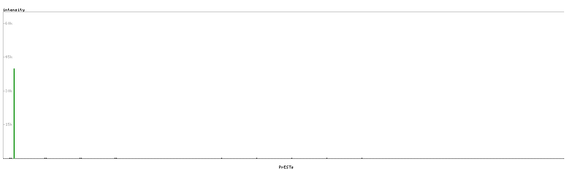 At the top of the view, the position of the antigen (identified by the corresponding HPA identifier) is shown as a green bar. A yellow triangle on the bar indicates a <100% sequence identity to the protein target.
