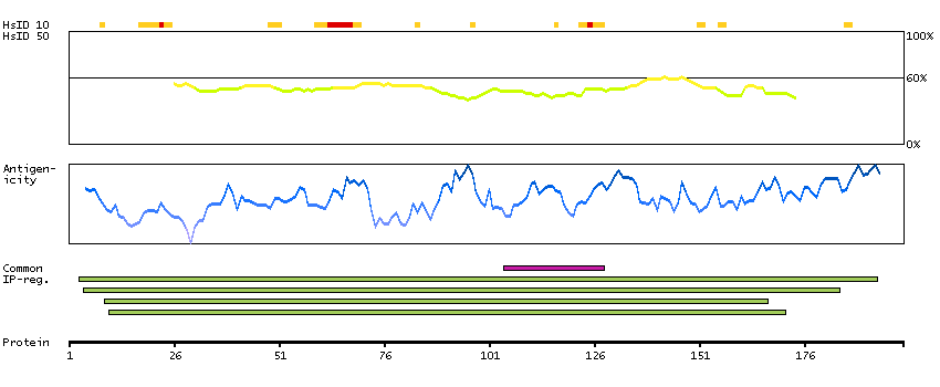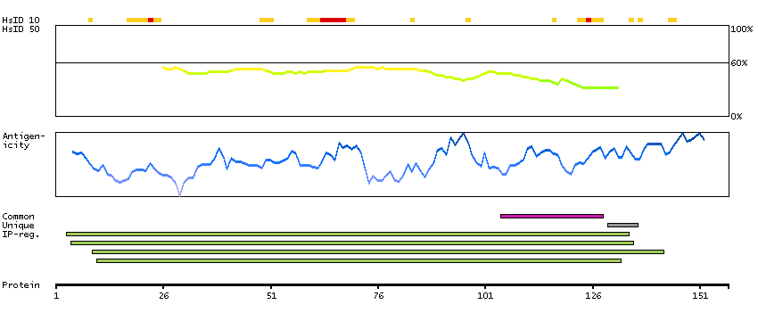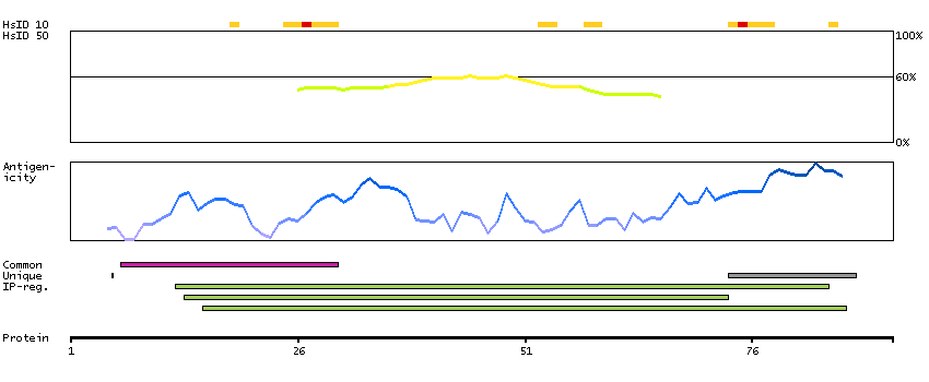 Under the antigens, the maximum percent sequence identity of the protein to all other proteins from other human genes is displayed, using a sliding window of 10 aa residues (HsID 10) or 50 aa residues (HsID 50). The region with the lowest possible identity is always selected for antigen design, with a maximum identity of 60% allowed for designing a single-target antigen (read more).