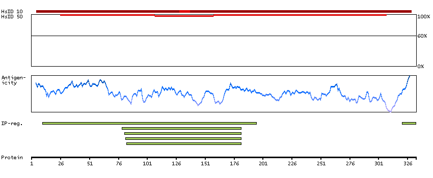 Under the antigens, the maximum percent sequence identity of the protein to all other proteins from other human genes is displayed, using a sliding window of 10 aa residues (HsID 10) or 50 aa residues (HsID 50). The region with the lowest possible identity is always selected for antigen design, with a maximum identity of 60% allowed for designing a single-target antigen (read more).