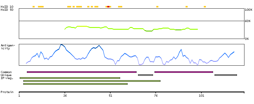 Under the antigens, the maximum percent sequence identity of the protein to all other proteins from other human genes is displayed, using a sliding window of 10 aa residues (HsID 10) or 50 aa residues (HsID 50). The region with the lowest possible identity is always selected for antigen design, with a maximum identity of 60% allowed for designing a single-target antigen (read more).