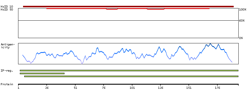 Under the antigens, the maximum percent sequence identity of the protein to all other proteins from other human genes is displayed, using a sliding window of 10 aa residues (HsID 10) or 50 aa residues (HsID 50). The region with the lowest possible identity is always selected for antigen design, with a maximum identity of 60% allowed for designing a single-target antigen (read more).